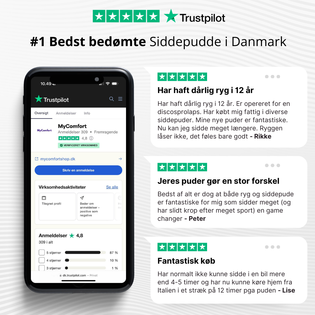 Mere end bare en pude MyComfort er ikke en hvilken som helst siddepude. Den er bygget op omkring vores egen ComfortFoam – en lidt tykkere og fastere memoryfoam end det du normalt finder på markedet. Den tilpasser sig din krop, fordeler vægten jævnt og holder sin form selv efter måneder med daglig brug. Godkendt til personer på 100+ kg uden at give efter.
